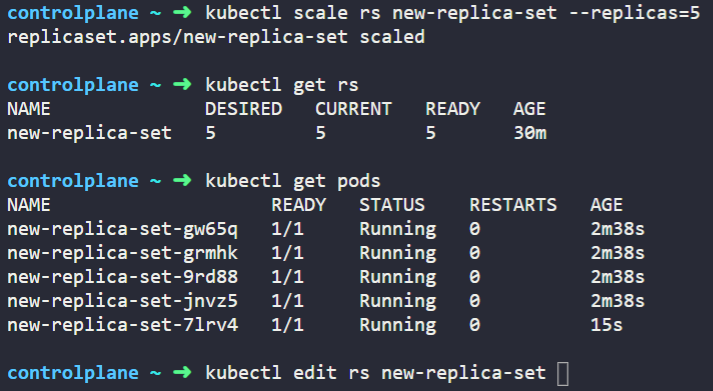 - kubectl scale --replicas=6 -f replicaset -definition.yml -> 제어 배율 명령 실행하여 복제본 수를 변경한다.
