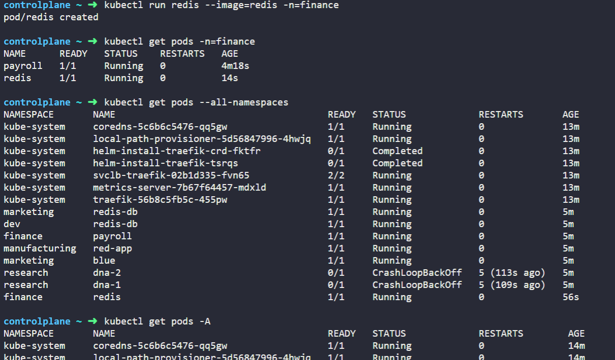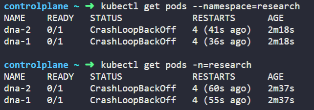 - 기본 defalut Namespace에 있는 것들을 보려면 kubectl get pods 명령어를 사용하지만 default 밖에 있는 것들을 보려면 kubectl get pods --namespace=kube-system과 같은 namespace 를 적어줘야 조회가 가능하다.