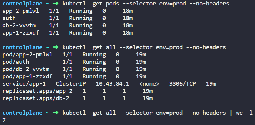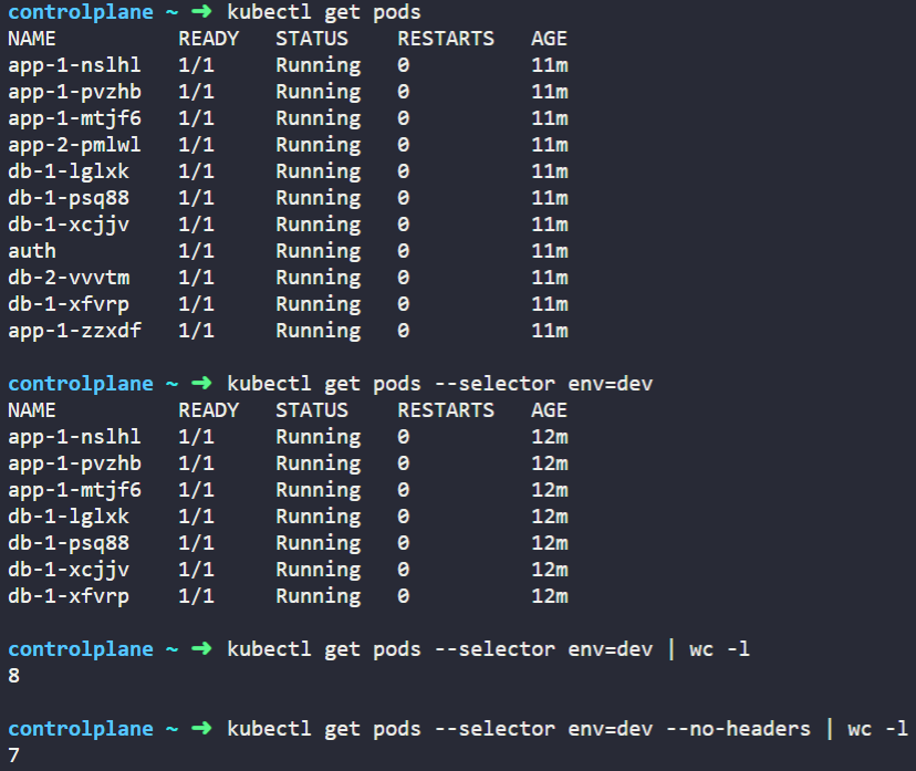 - kubectl get pods --selector env=dev | wc -l pod의 갯수를 세어준다.