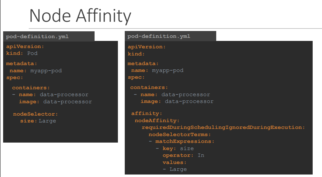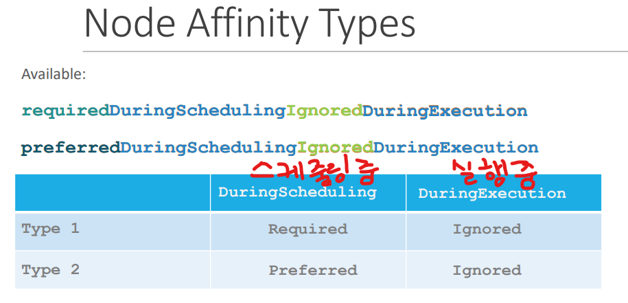 - Pod 가 처음 생성되면 지정된 선호도 규칙을 따라 Pod를 올바른 Node에 배치하는게 고려된다.