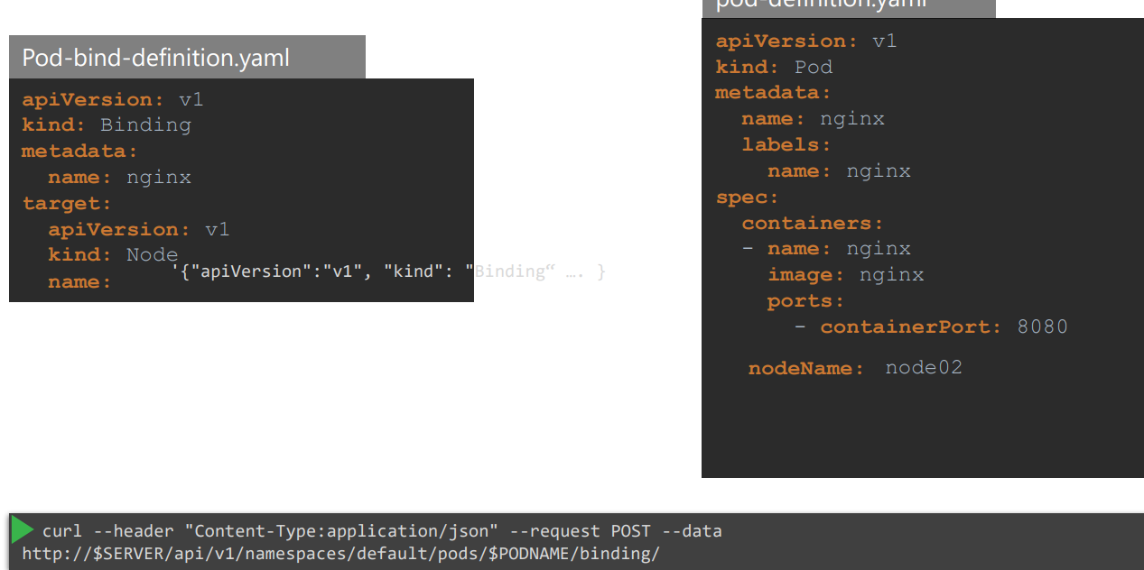 - 한개의 Pod 의 nodename을 수정할 수 없게 하기 때문에 binding 개체를 생성해서 POD 의 binding API 에 게시 요청을 보낸다. -> Scheduler가 하는 일을 모방하는 방법이다.