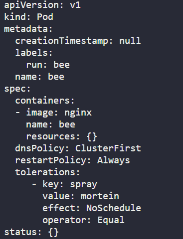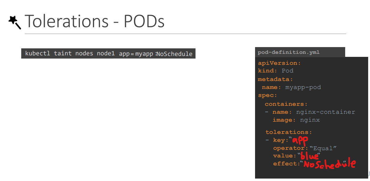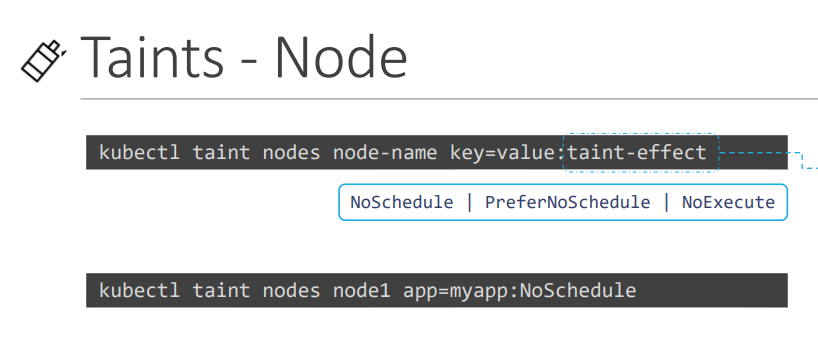 - Taint 는 Node에만 설정할 수 있고 Tolerations 는 POD에만 설정 할 수 있다.