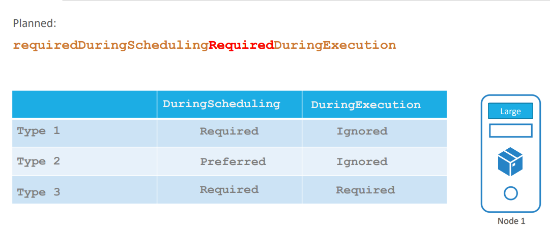 - 위의 그림에서는 선호도 규칙에 부합하지 않는 Node에서 실행중인 Pod를 빼낸다. 예시로 Node 1에서 실행되는 pod는 Node에서 라벨 Large가 제거되면 퇴출되거나 종료된다.
