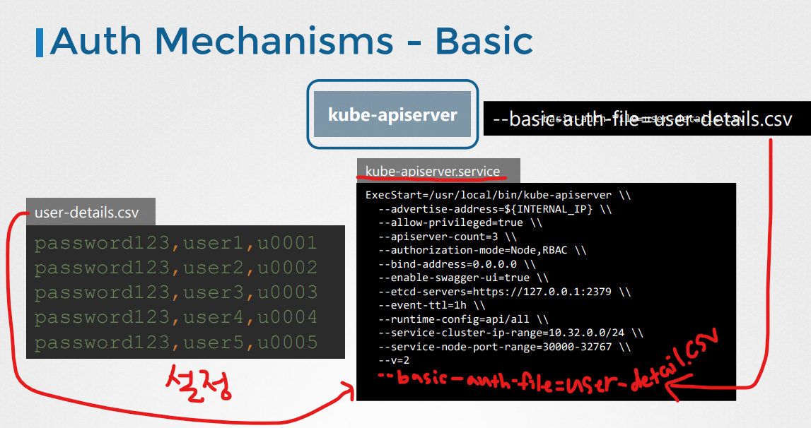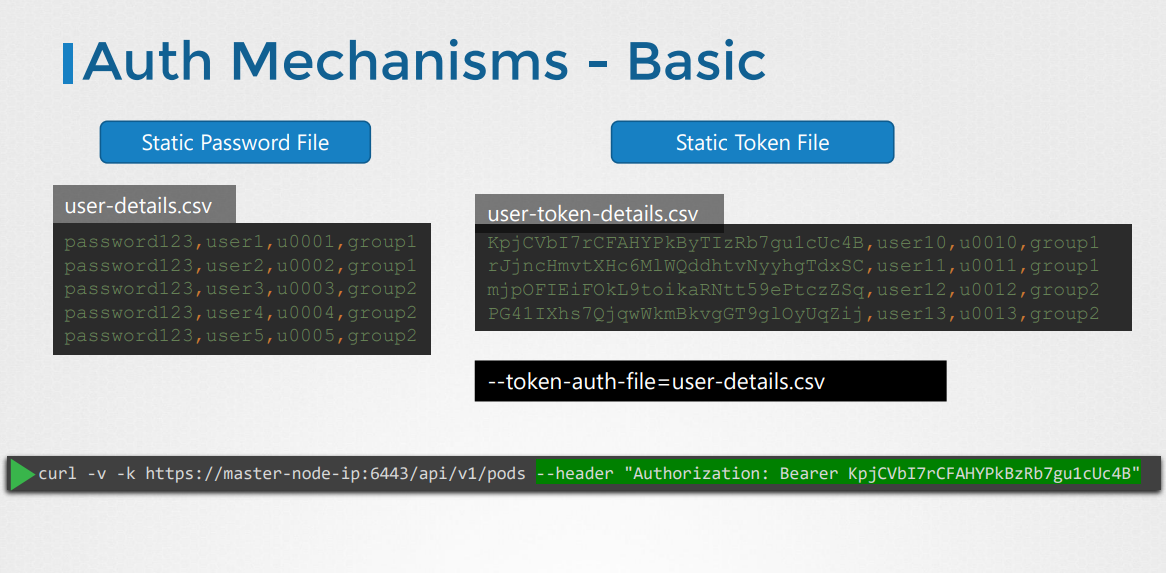 - 고정 파일에 사용자 이름, 암호, 토큰을 명확한 텍스트에 저장하는 이 인증 메커니즘들은 불안정하기 때문에 권장하지 않는다.