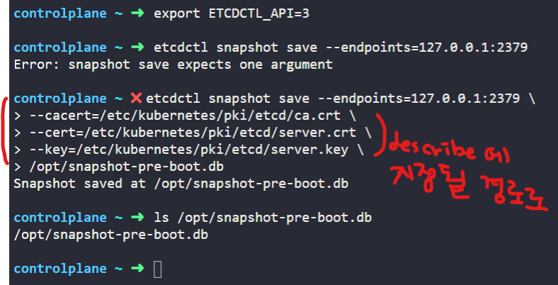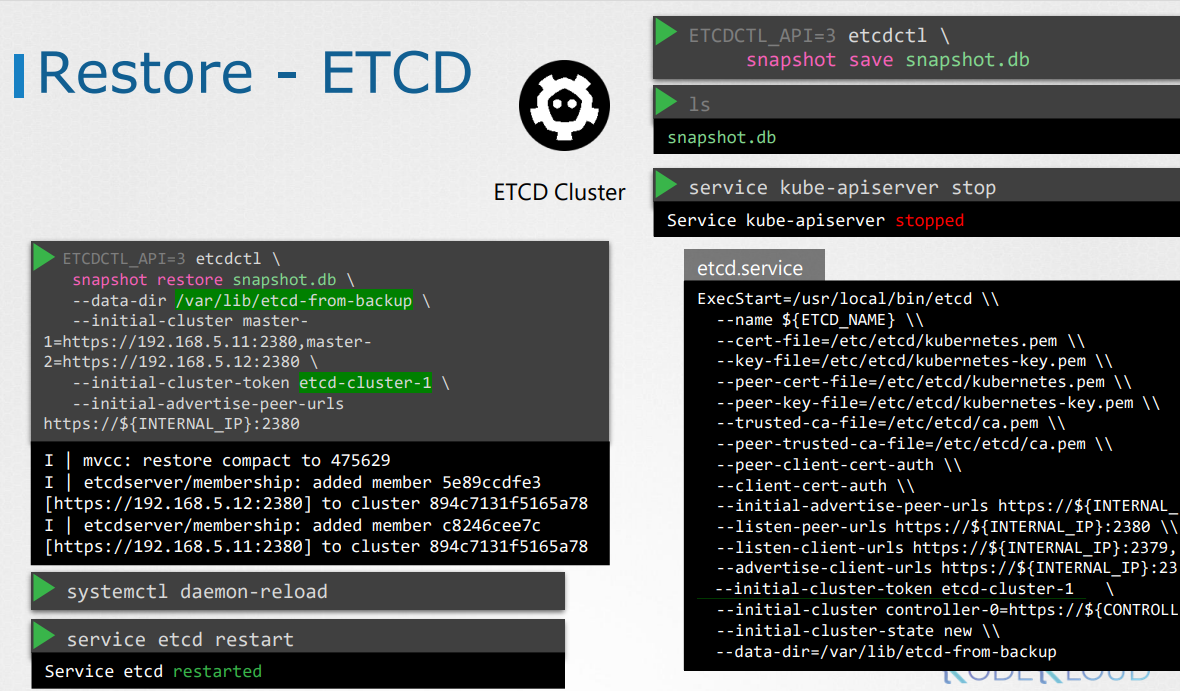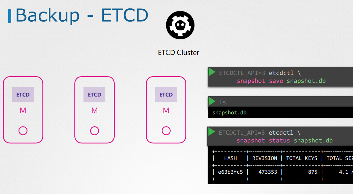 - ETCD는 또한 빌트인 스냅샷 솔루션도 가지고 온다. ETCD controll utility 스냅샷을 이용해 db 스냅샷을 찍을 수 있다.