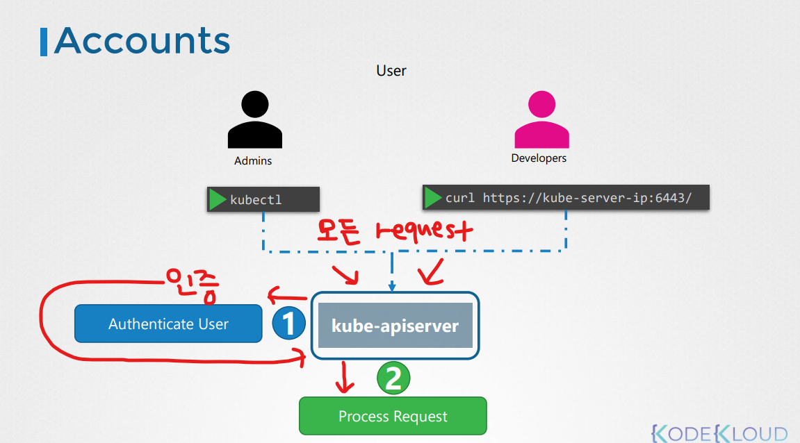 - 관리자 같은 유저는 관리 업무를 수행하기 위해 클러스터에 엑세스하고 개발자는 앱을 테스트 또는 배포하기 위해 클러스터에 엑세스한다.
